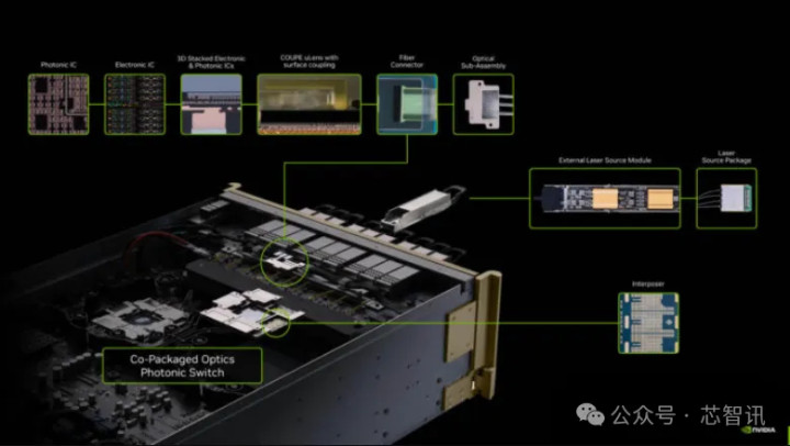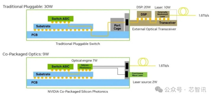 然而,传统光学模组仍需经过PCB与外插式收发器,信号路径长、能耗依旧高。而硅光子芯片(Silicon Photonics)的出现,则将光学元件直接整合在交换器ASIC封装旁,形成所谓共封装光学(Co-Packaged Optics,CPO)。 这样的设计大幅缩短了信号传输路径,降低了功耗与延迟,并提升了可靠性。