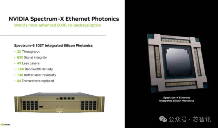 英伟达还推出了一个 102T 交换机,即集成硅光子学的 Spectrum-6 102T 交换机,将带来可靠性的大幅提升和功耗的大幅降低。