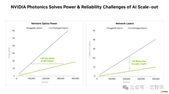 此外,与可插拔收发器相比,Spectrum-X Photonics具有更好的信号完整性和更低的 DSP 要求,因为在此实现中,光子引擎 (PIC) 紧邻交换机 ASIC。这意味着没有较长的 PCB 走线和激光数量急剧减少。例如,1.6 Tb/s 的链路从 8 个激光器下降到只有2个激光器,这意味着更低的功耗和更高的传输可靠性。