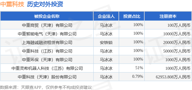 本站消息,根据天眼查APP显示,中重科技(603135.SH)新增一起对外投资事件,被投资公司为中重灵希机器人科技(江苏)有限公司,法定代表人马冰冰,投资占比为51%。该公司从事专业技术服务业,注册资本为1000万人民币。目前,中重科技共存在对外投资7项,详见下表: